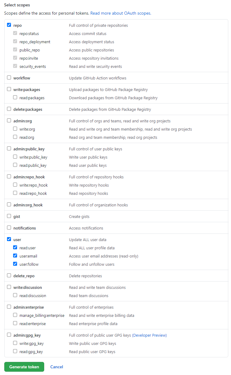 단순히 Git CLI에서 Repo의 pull, push만을 수행한다면, repo와 user의 권한만 체크하고 발급 받는 것이 좋다고 하는데... 이러한 권한에 대해서도 추후 알아놓으면 좋을듯하다